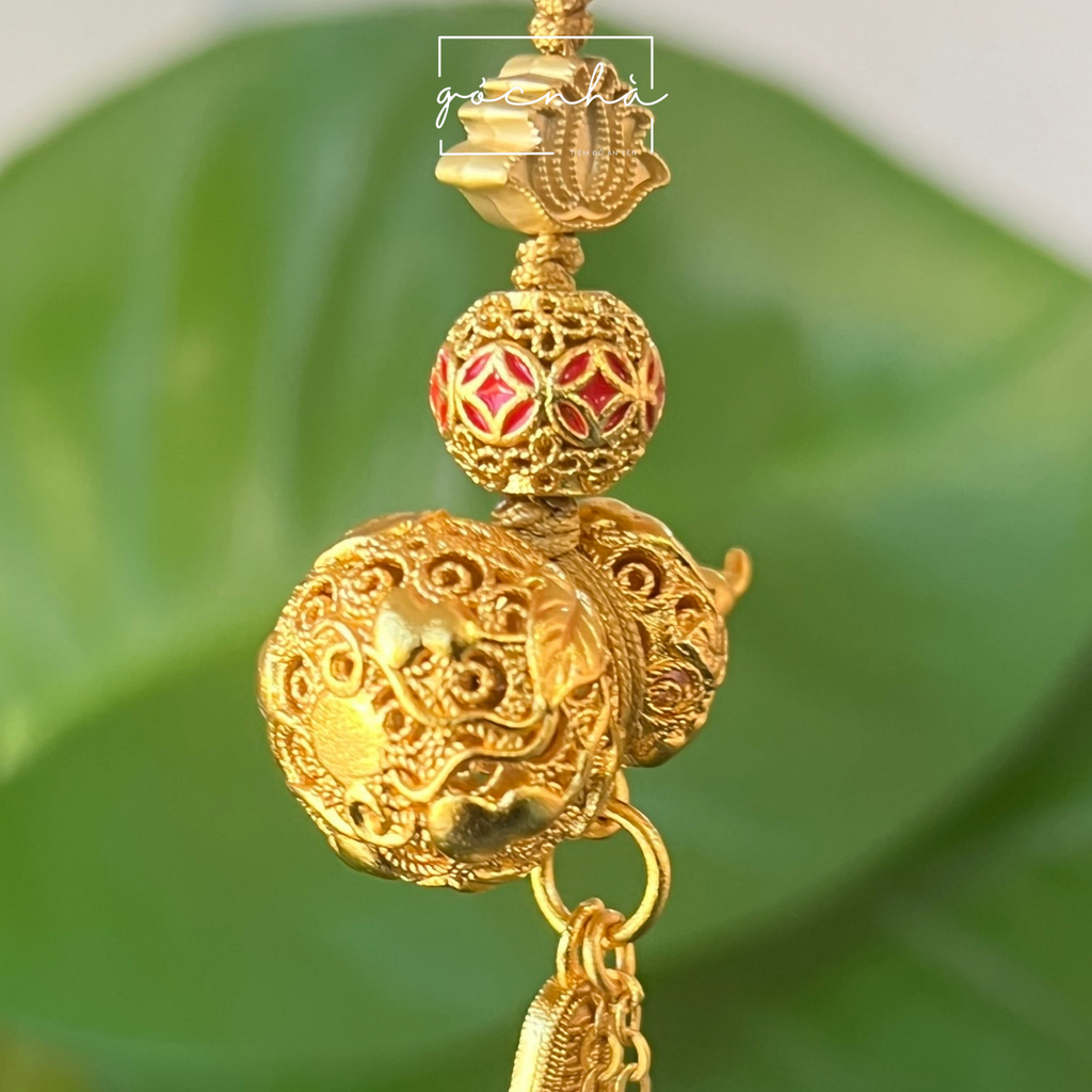 Chi tiết thiết kế: Charm hoa sen – đồng xu tài lộc – lá nho – thẻ chúc – ngọc trai nhân tạo – chuông mạ vàng.