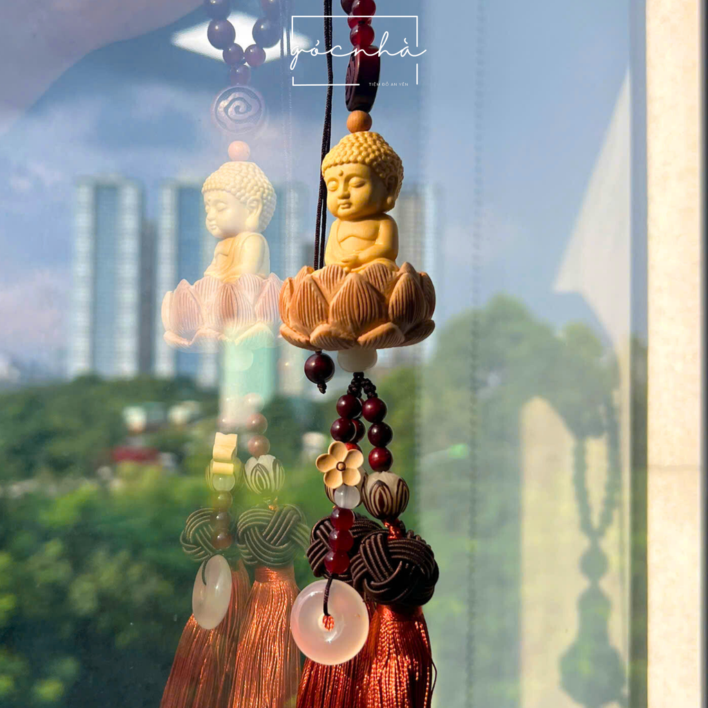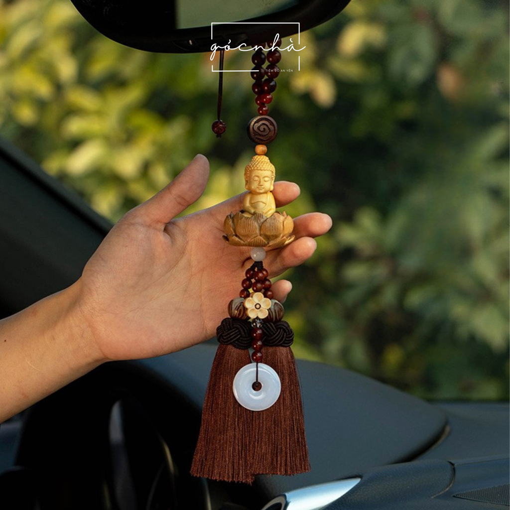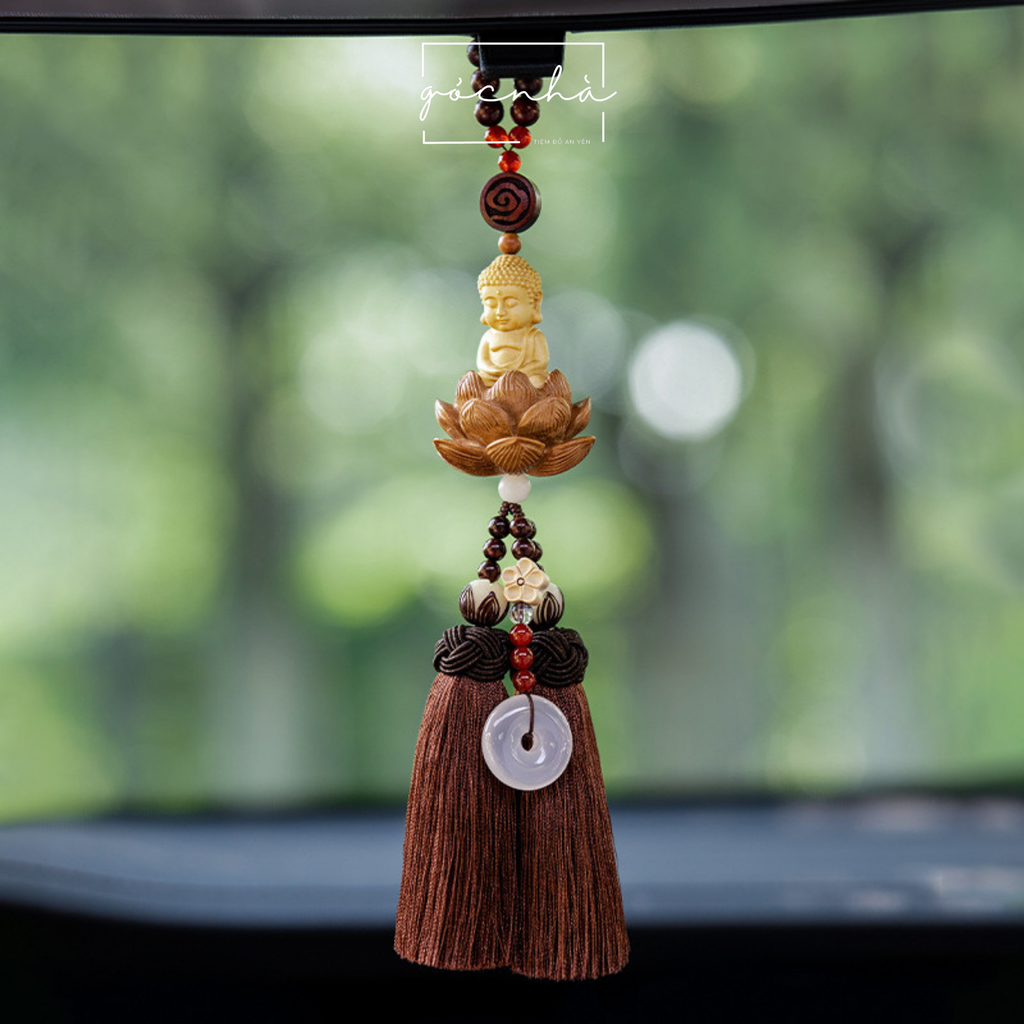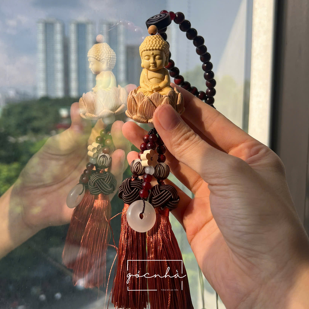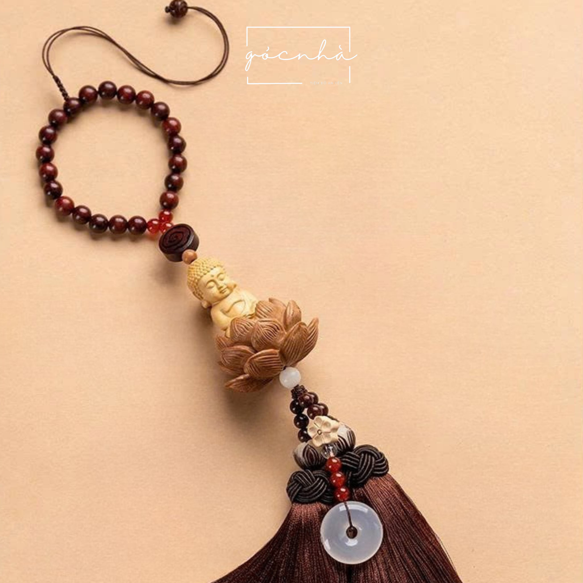Phía dưới khánh treo là những hạt gỗ và ngọc phối hợp khéo léo, tượng trưng cho sự kết nối giữa con người và thiên nhiên. Sợi chỉ nâu đan thủ công kết hợp tua rua mềm mại, vừa mang vẻ cổ điển, vừa là điểm nhấn trang nhã cho không gian xe, cửa sổ hay góc phòng riêng.
