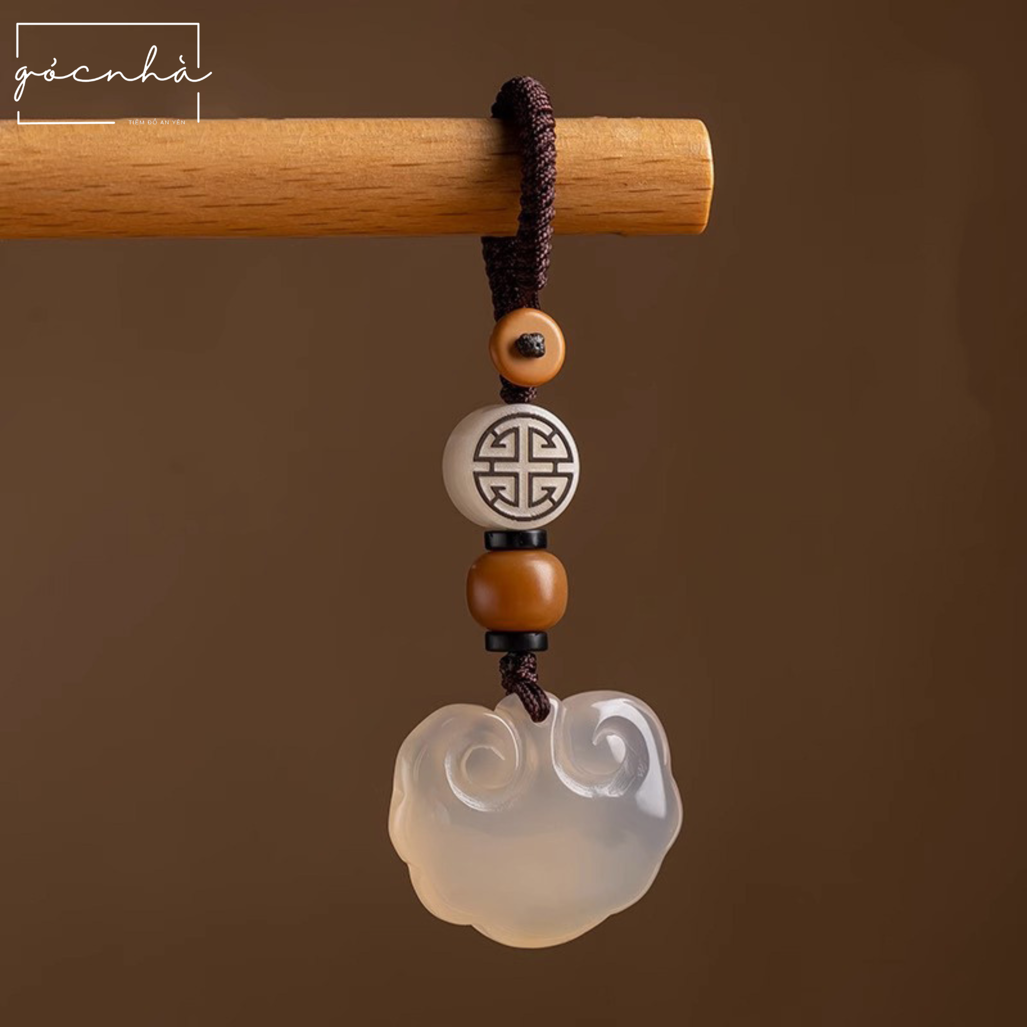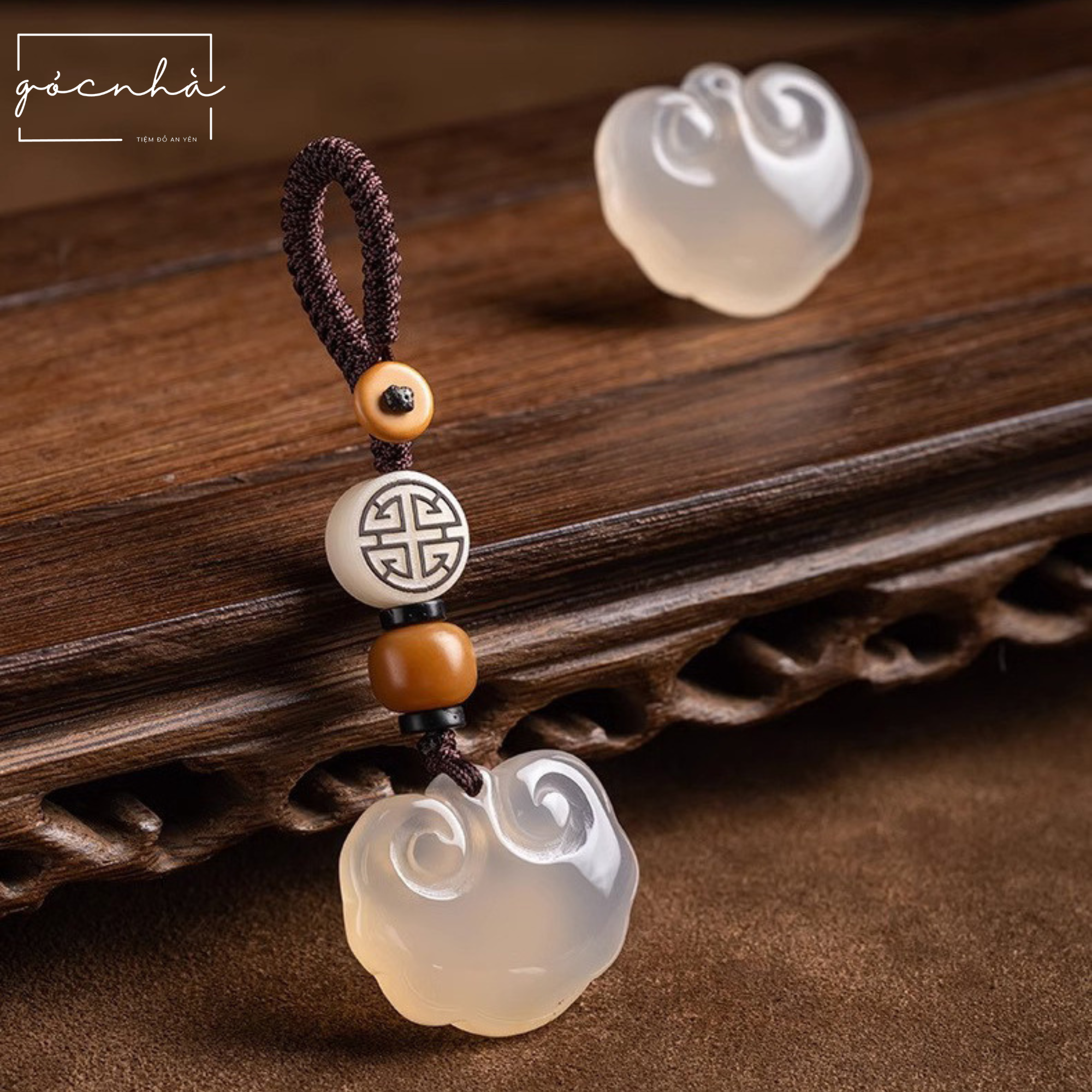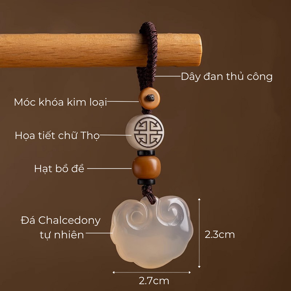 Móc treo “Như Ý Cát Tường” được chế tác thủ công tỉ mỉ từ dây đan thủ công chắc chắn, đá Chalcedony tự nhiên mang năng lượng an lành, kết hợp cùng hạt bồ đề và họa tiết chữ Thọ khắc tinh xảo.